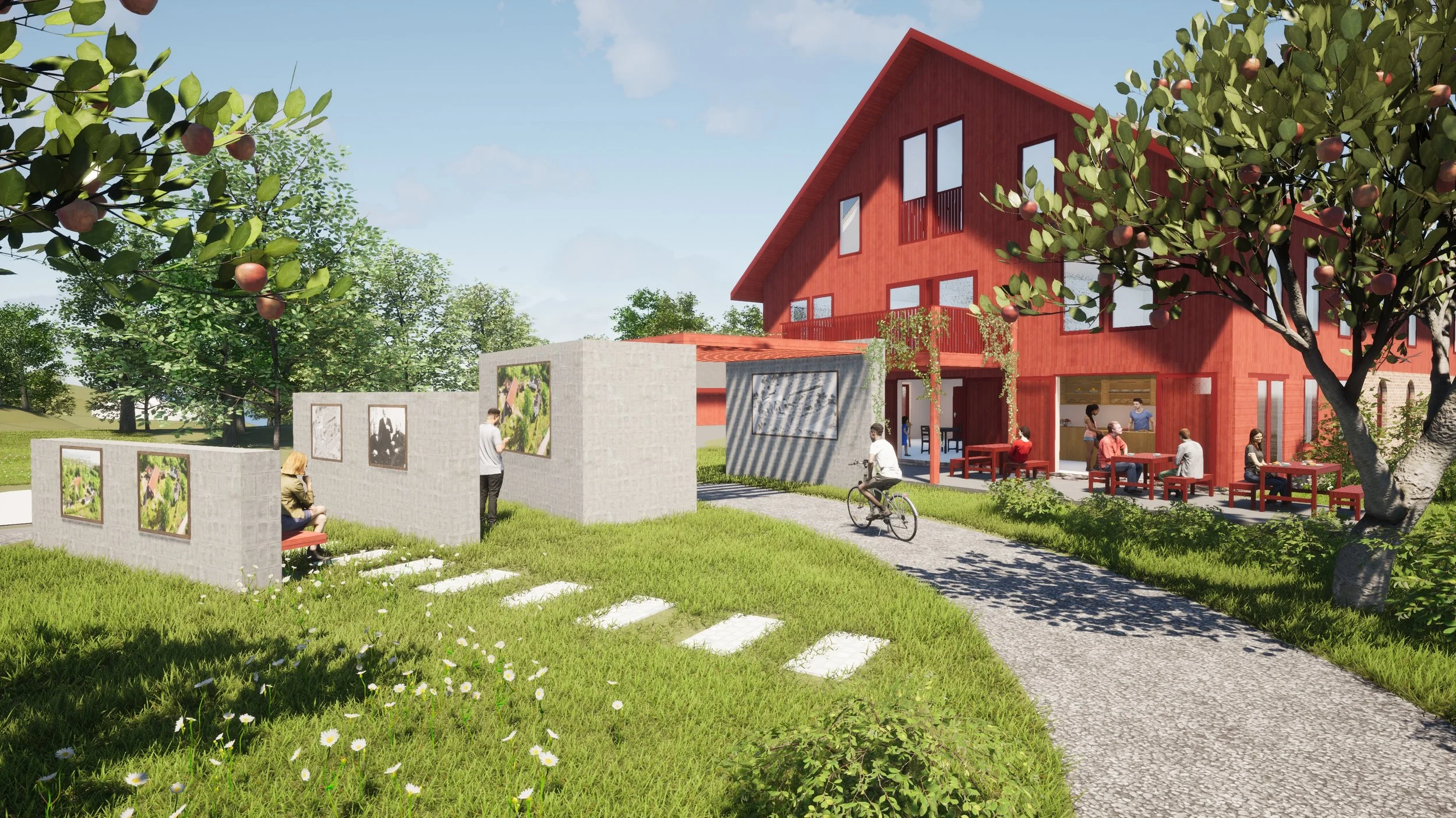 Forslag til kultur og historieformidling ved den gamle låvebroen. Låven åpnes opp med cafe og gårdsbutikk. Illustrasjon: Frost arkitekter