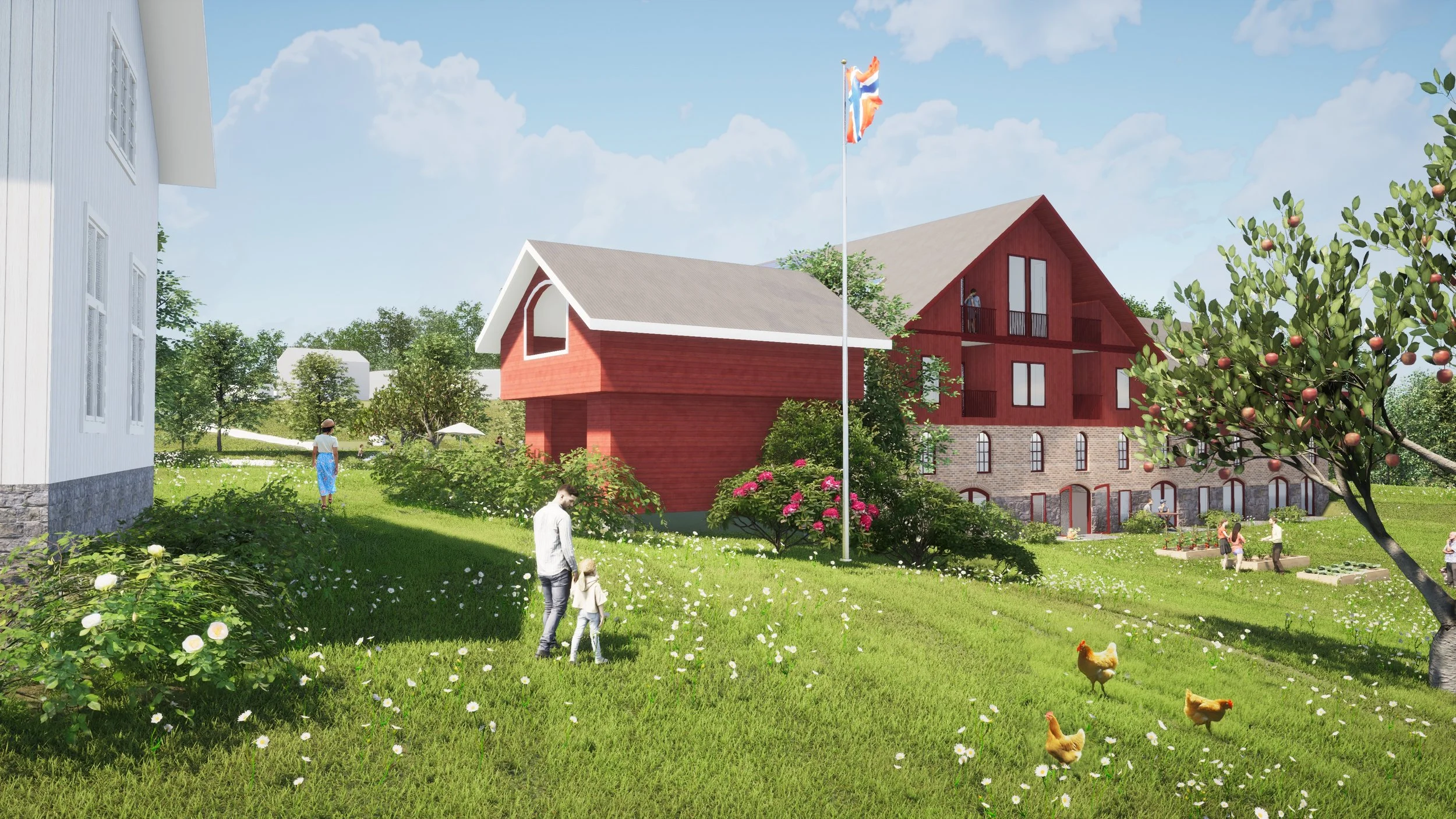 Felles møteplass med plass for dyrking og sosiale sammenkomster for beboerne, mot kulturlandskapet i øst. Illustrasjon: Frost Arkitekter