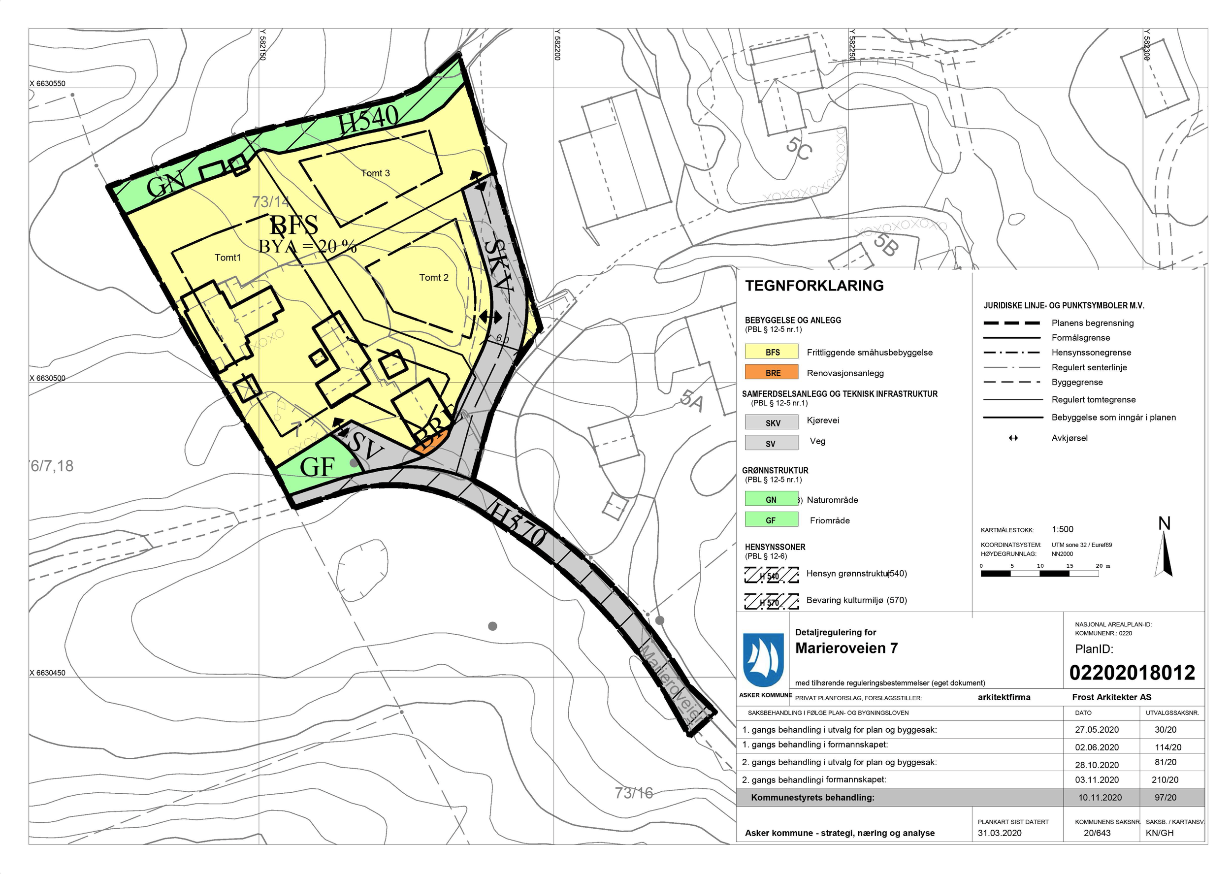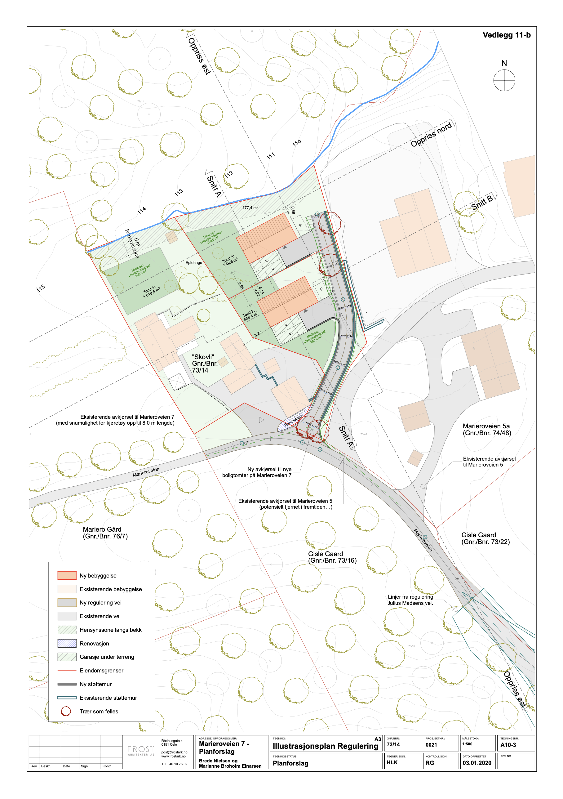 Eiendommen deles i tre hvor den vestre delen, som ligger høyest i terrenget, forbeholdes eksisterende bebyggelse. De to nye boligtomtene legges i skråningen mot eiendommens østre grense med egen adkomstvei fra Marieroveien. Byggenes plassering og utforming tilpasses terrenget og nyttegjør seg terrengfallet for å kunne legge arealer under bakken. Ny bebyggelse legges på tvers av terrenget for å sørge for best mulig utsikt mot øst for eksisterende bolig og anneks. De nye boligene legges lavere enn den eksisterende bebyggelsen for å underordne seg denne og for å følge terrengets fall mot øst. Denne plasseringen av den nye bebyggelsen er også med på å minimere påvirkningen det nye tiltaket har på kulturmiljøet knyttet til Mariero Gård og de fredete bygningene der. Sett fra områdene oppe ved Mariero Gård vil ny bebyggelse ligge delvis skjult bak eksisterende bebyggelse.