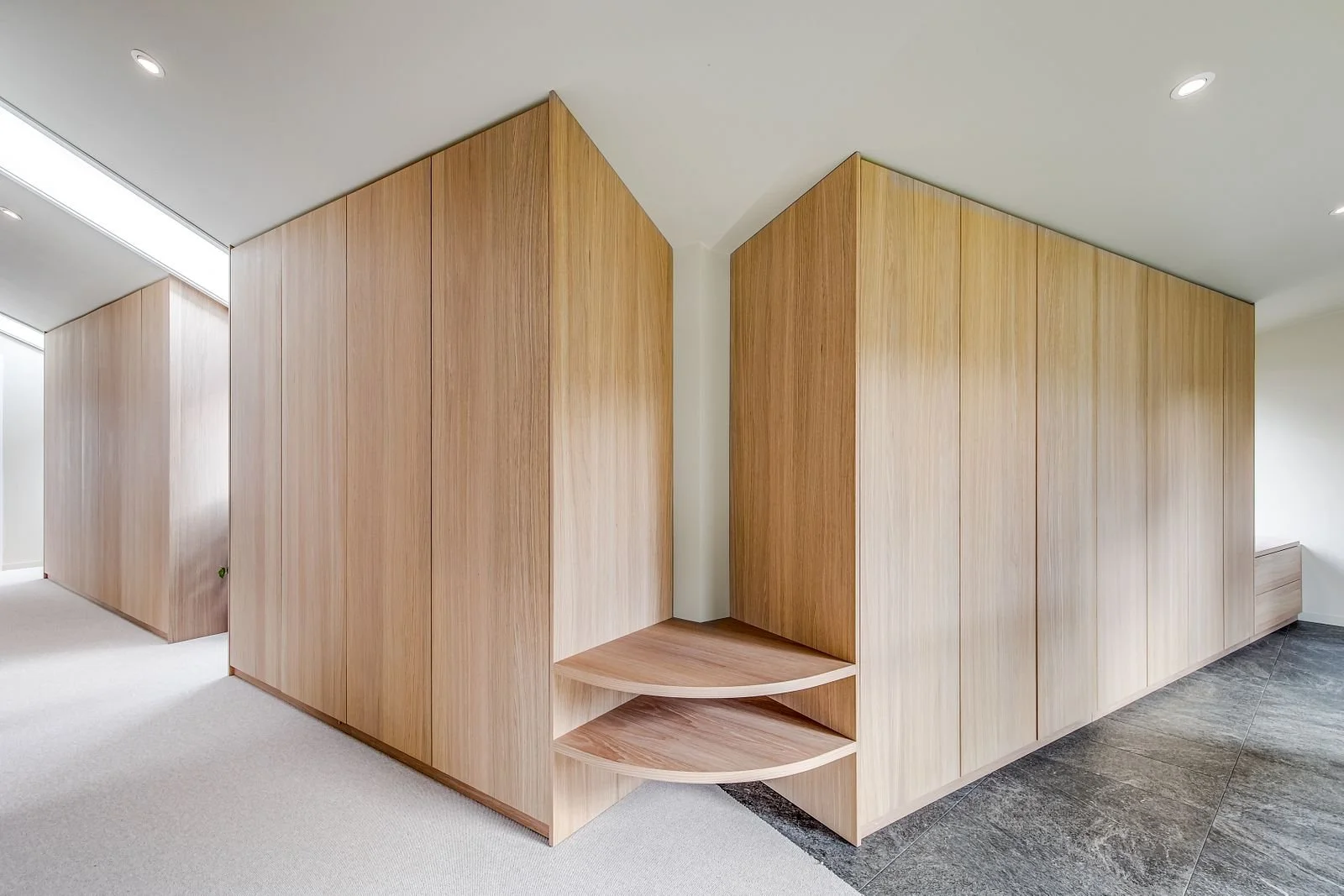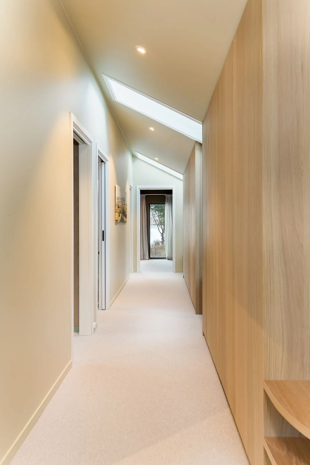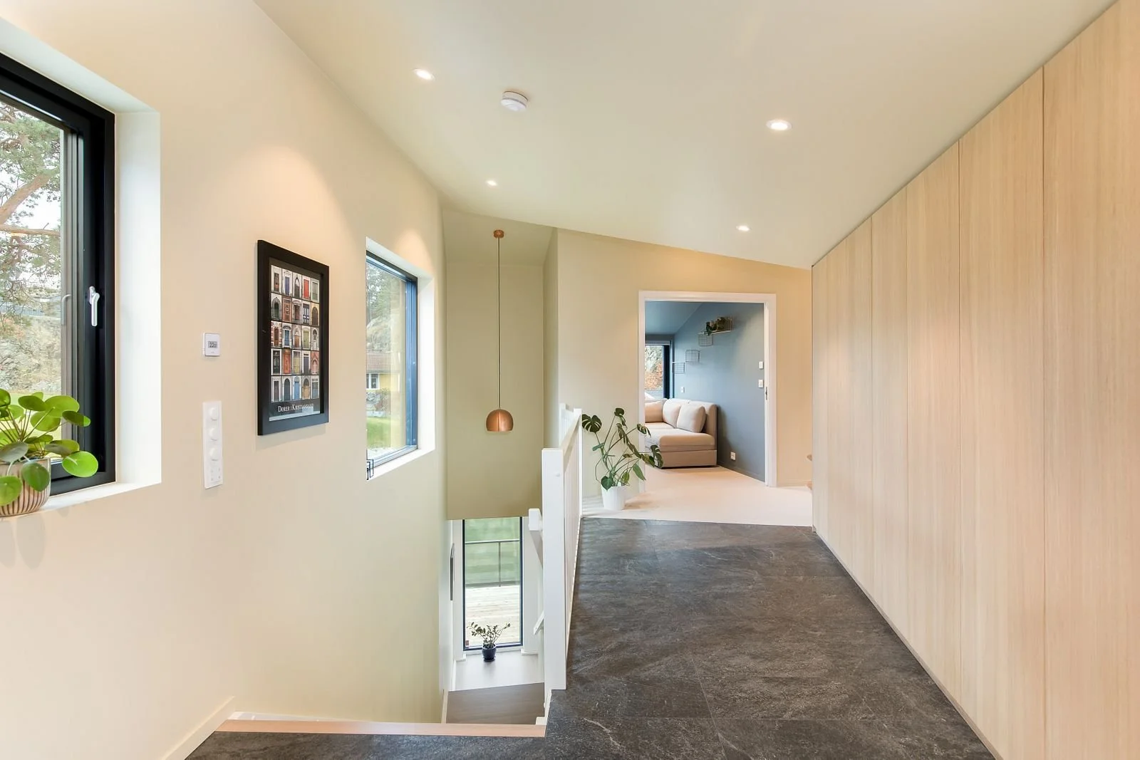 Internt i boligen oversvømmes gangarealene med dagslys fra takvinduer, og spesialtilpassede møbler skaper en sterk og minimalistisk opplevelse av rommene. Det er lagt vekt på høy kvalitet i utførelse og overflater, med detaljer i tre, naturstein og betong.