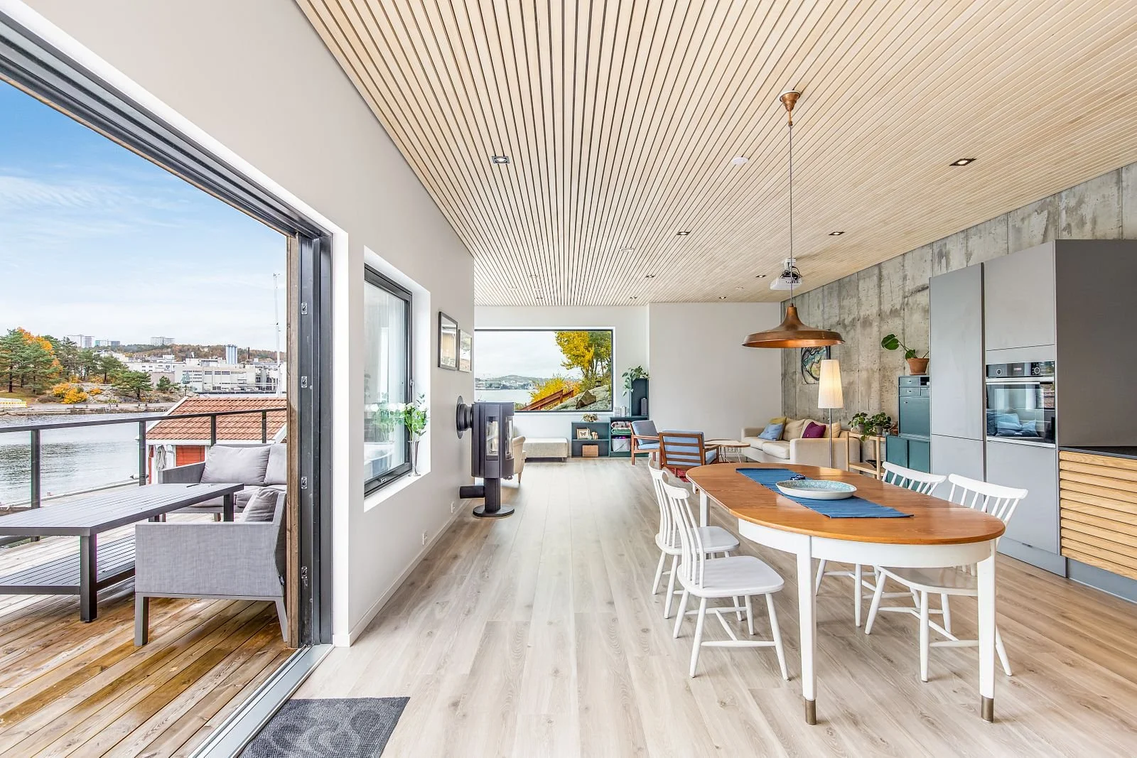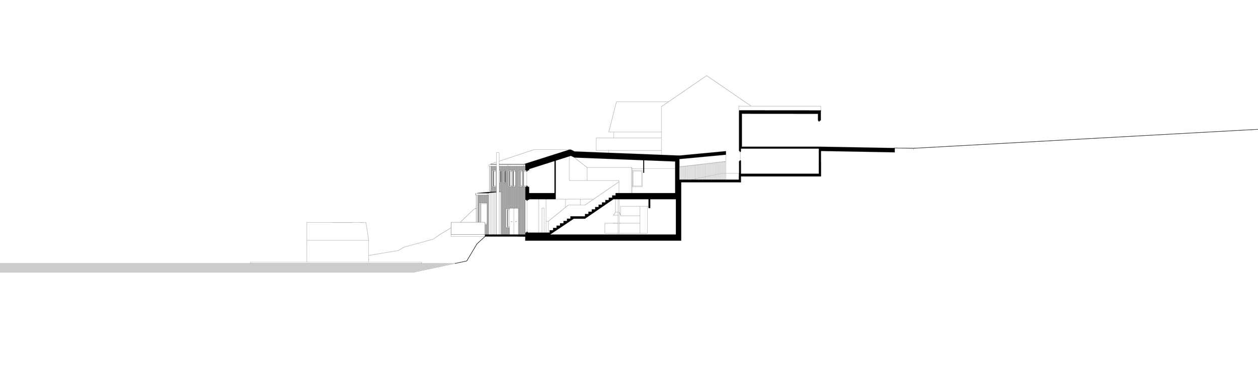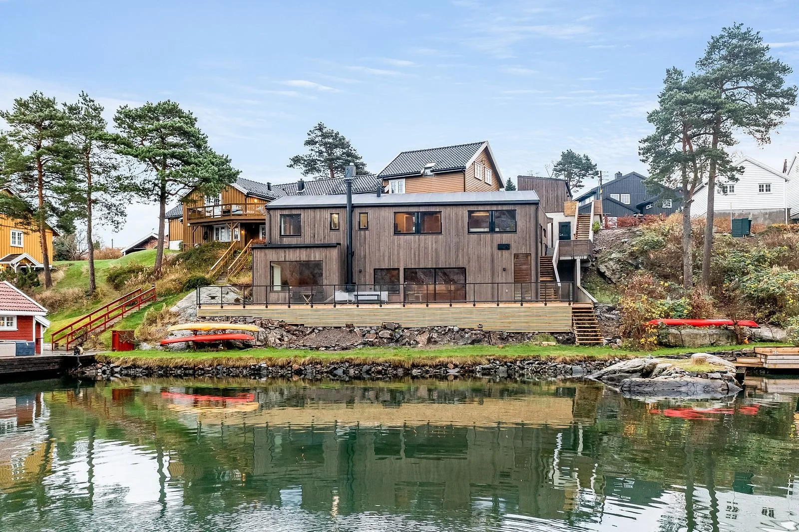 Den nedtrappende boligen ved vannkanten i Kristiansand gradueres i høyde både internt og eksternt ned mot vannflaten. På den måten lander boligen skånsomt på eiendommen og tilpasser seg de omkringliggende husene. Boligen er formet med en vinkel for å oppta eiendommens form og terrenget på best mulig vis.