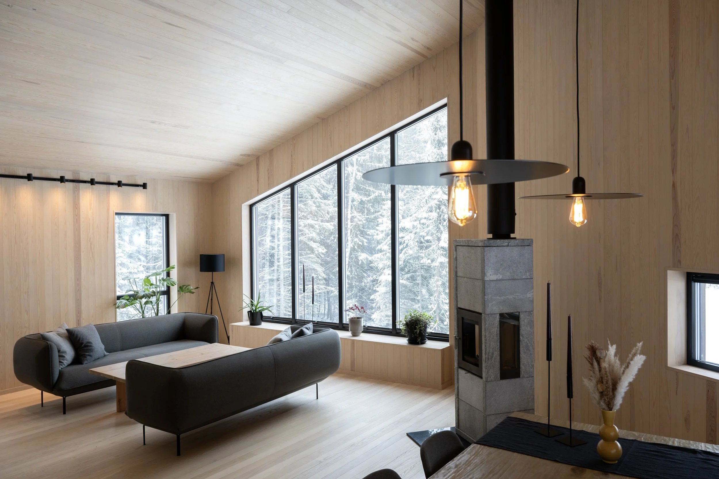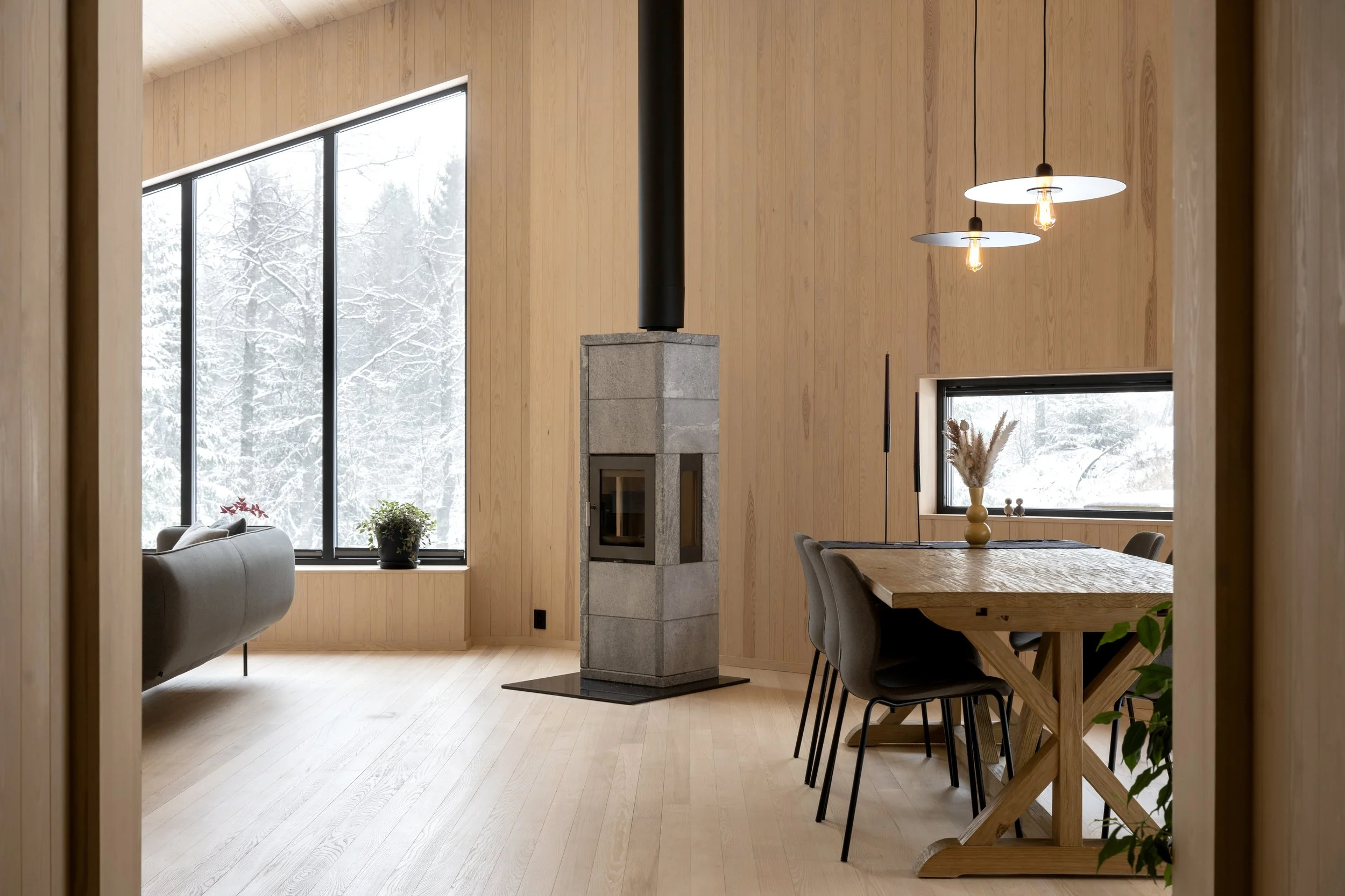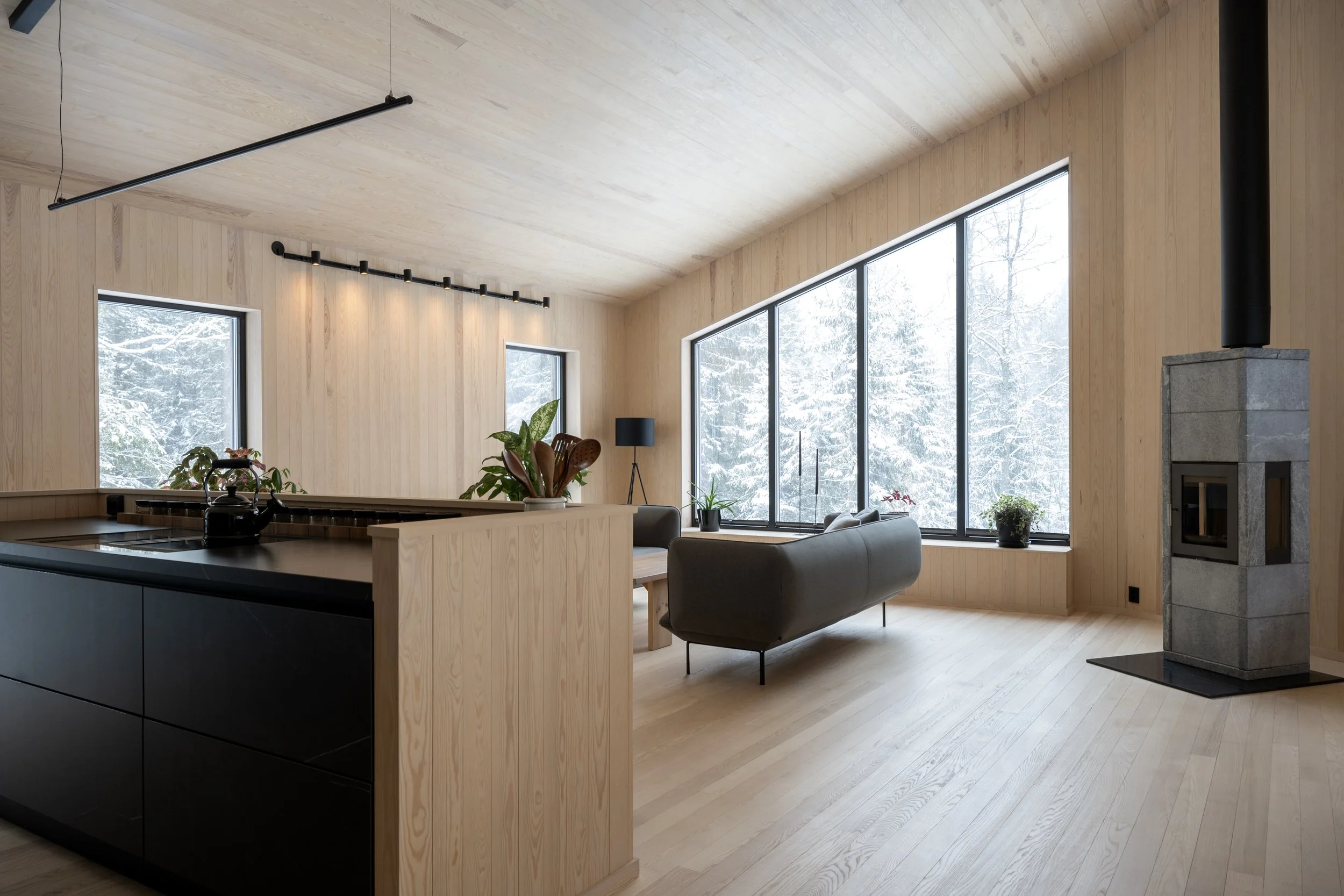 Boligen er oppført med saltak, noe som gir god takhøyde i det åpne stue/kjøkkenrommet med store vinduer som åpner opp mot skogen.