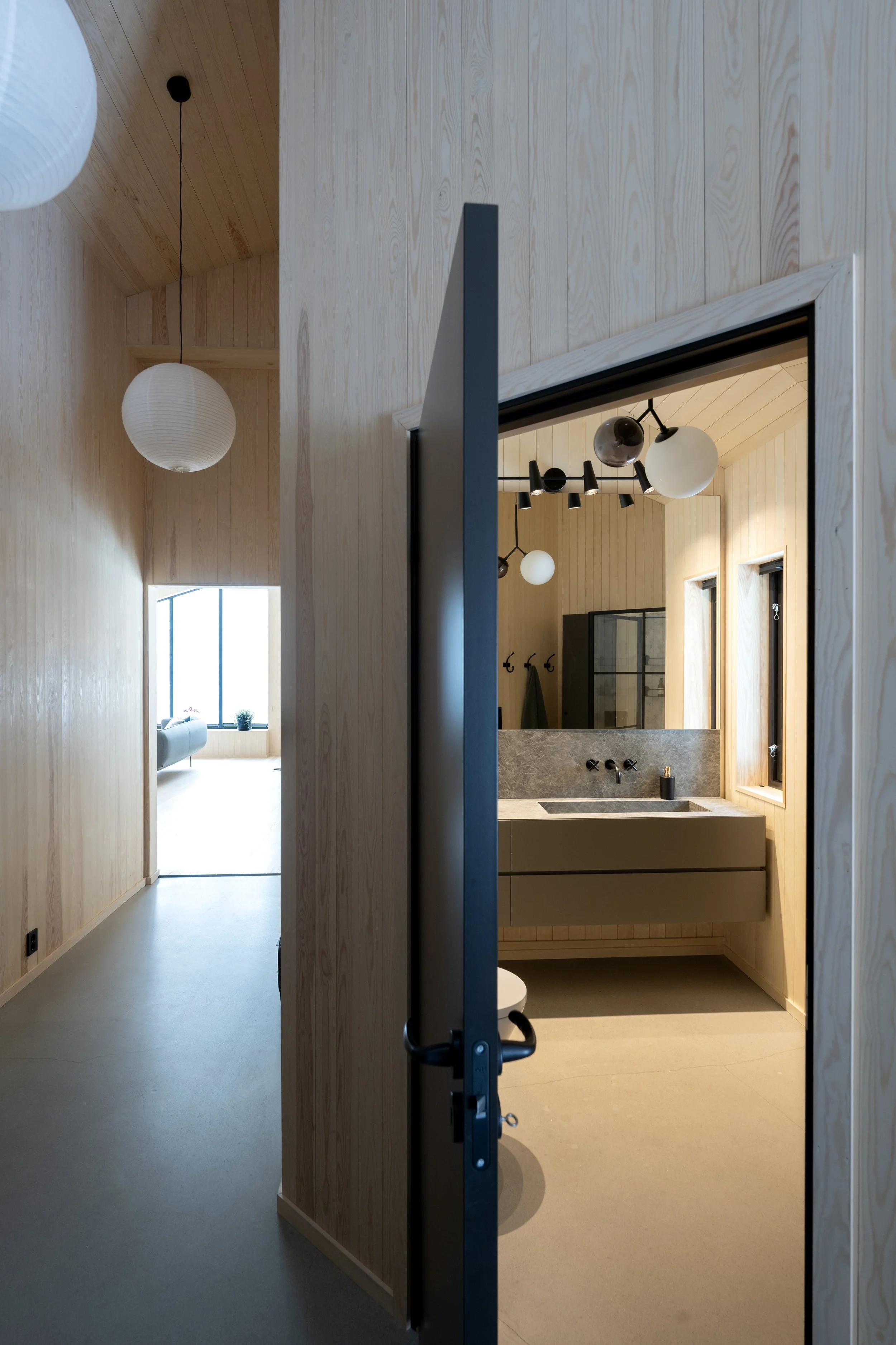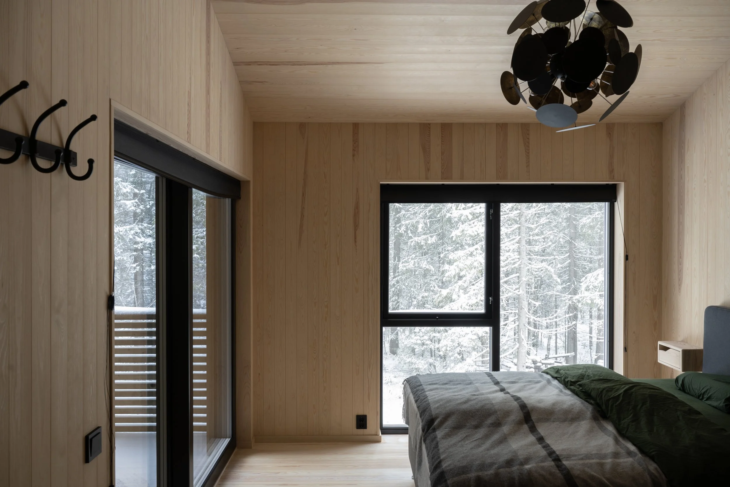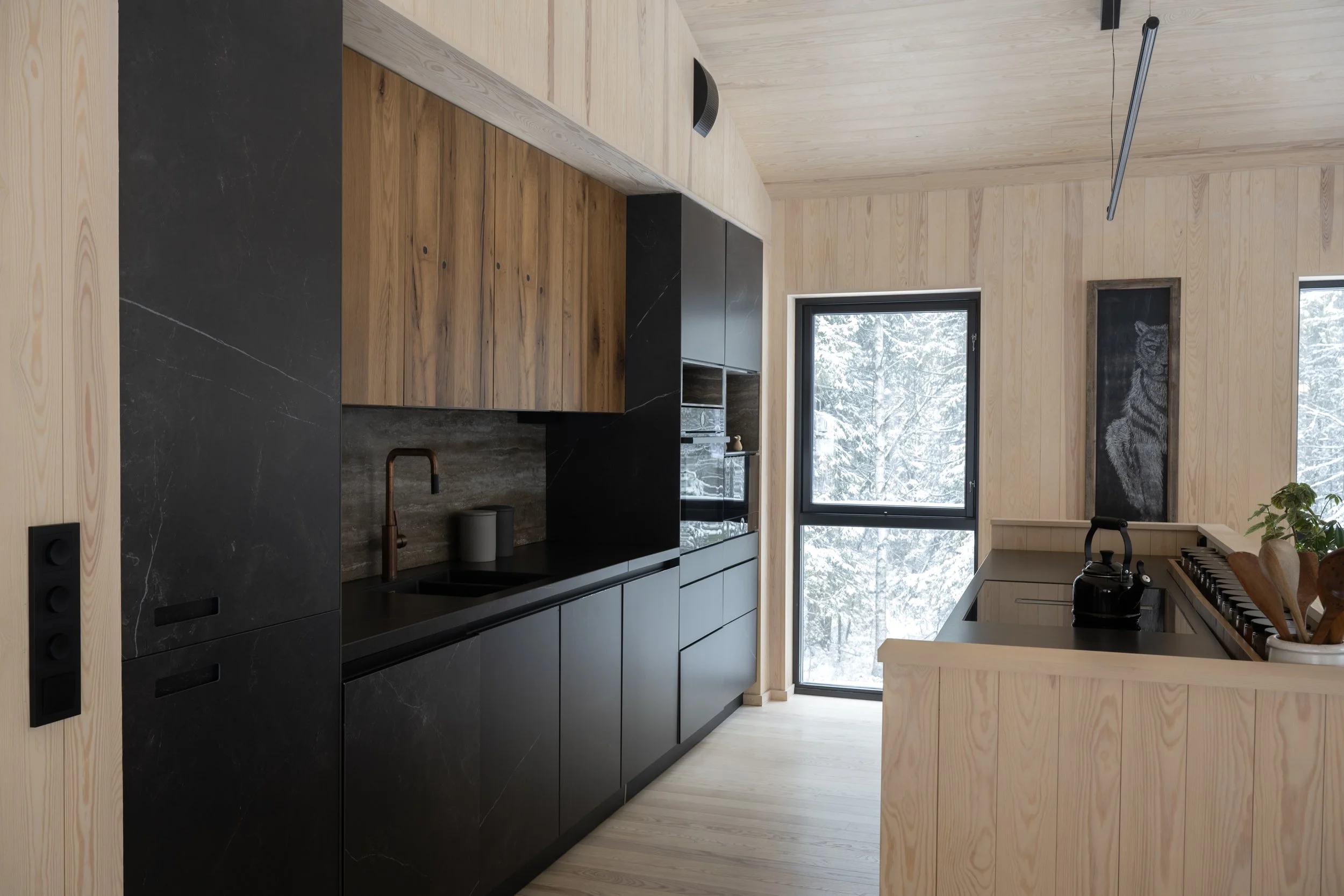 Boligen er oppført med saltak, noe som gir god takhøyde i det åpne stue/kjøkkenrommet med store vinduer som åpner opp mot skogen.