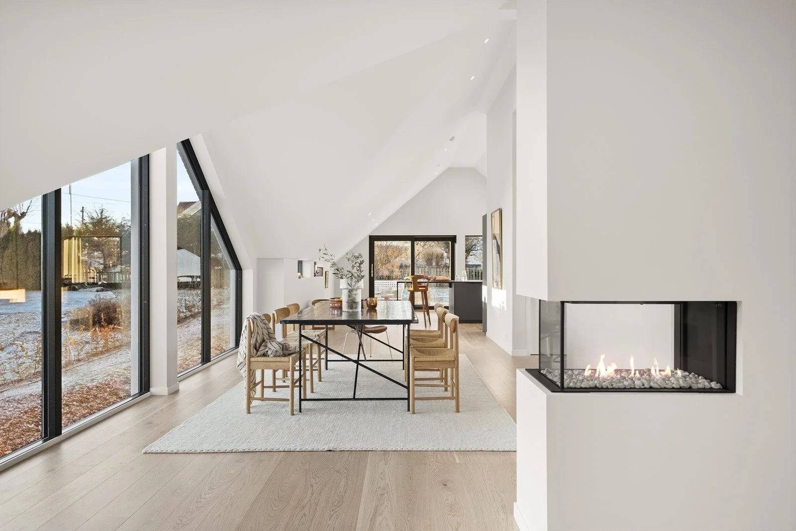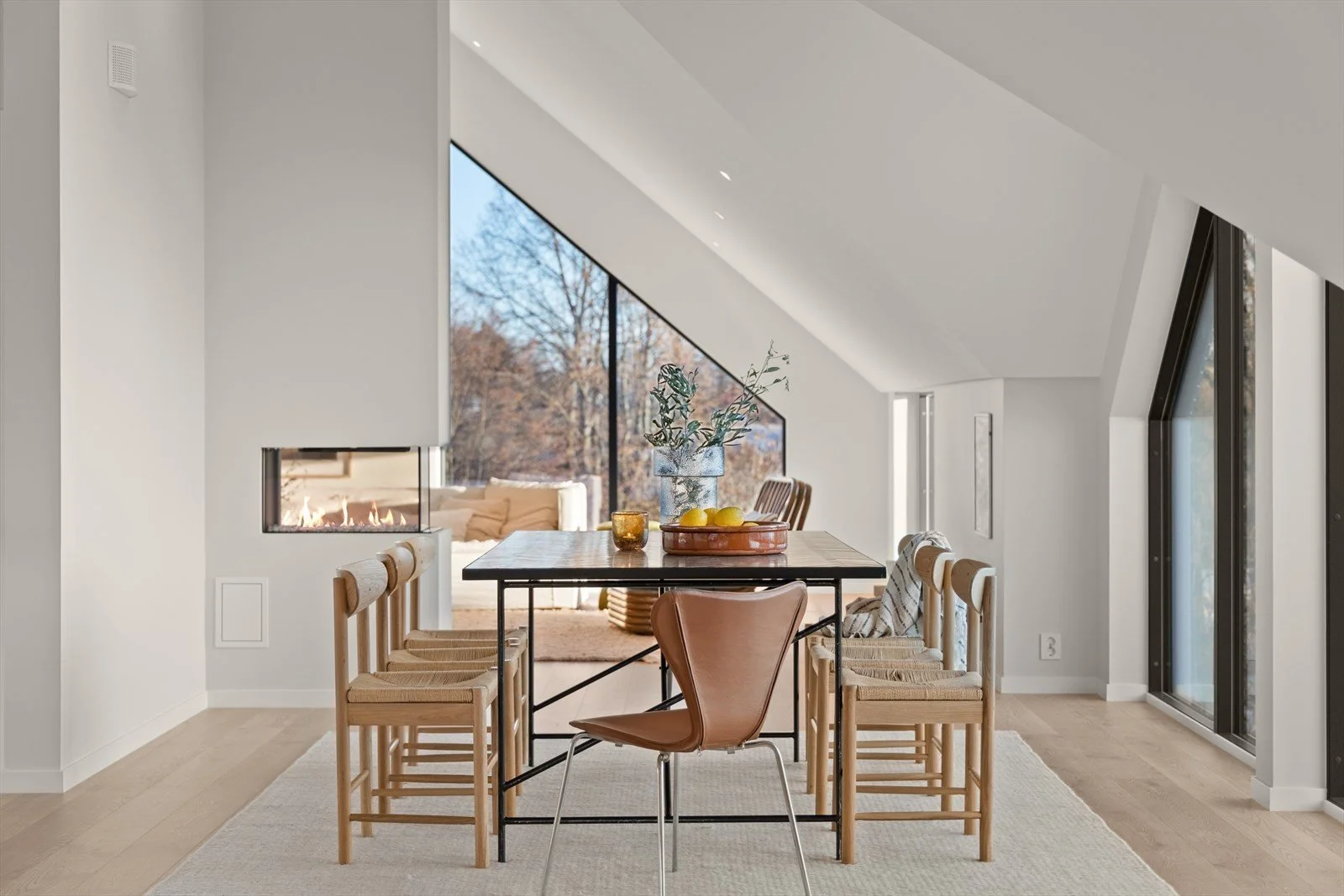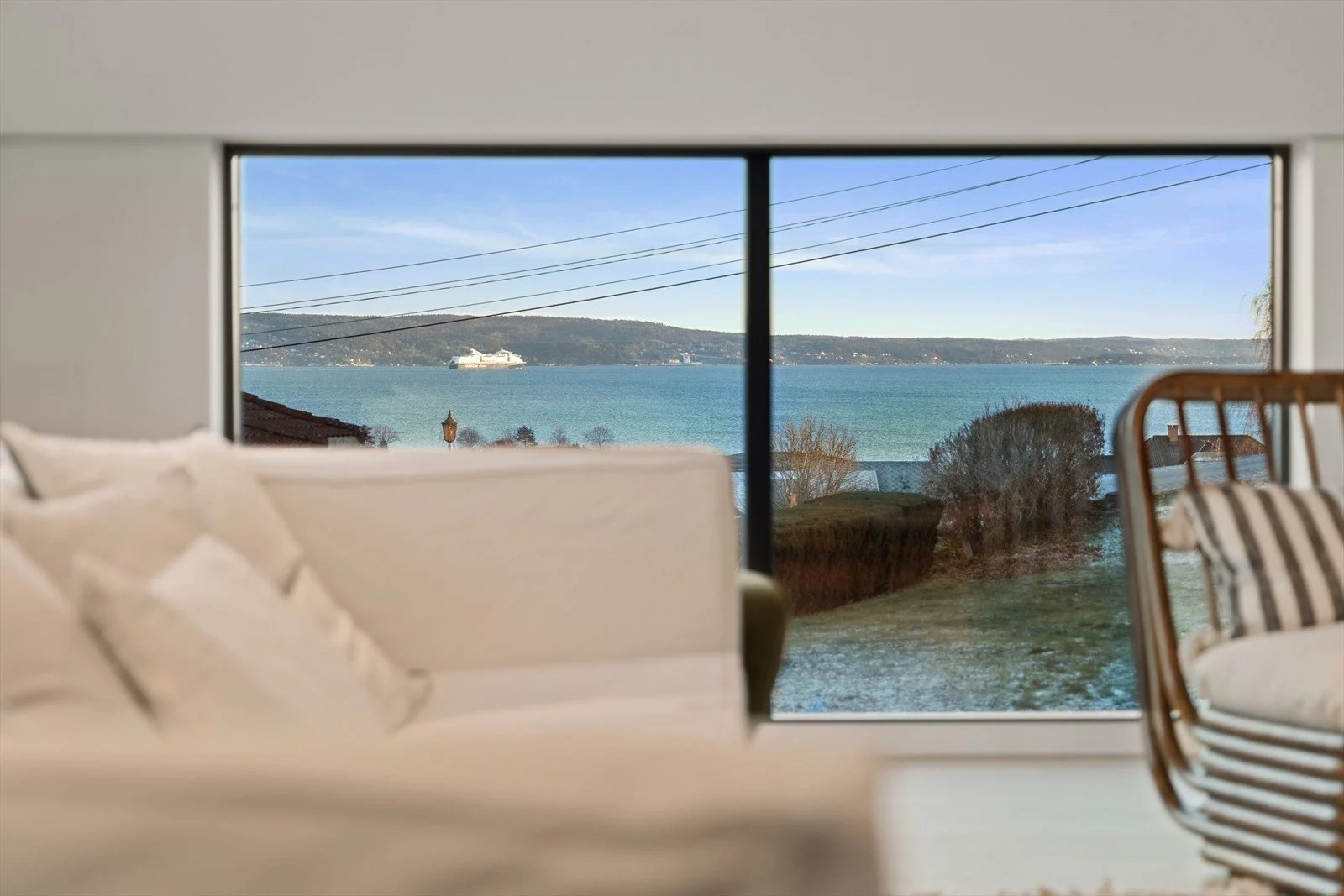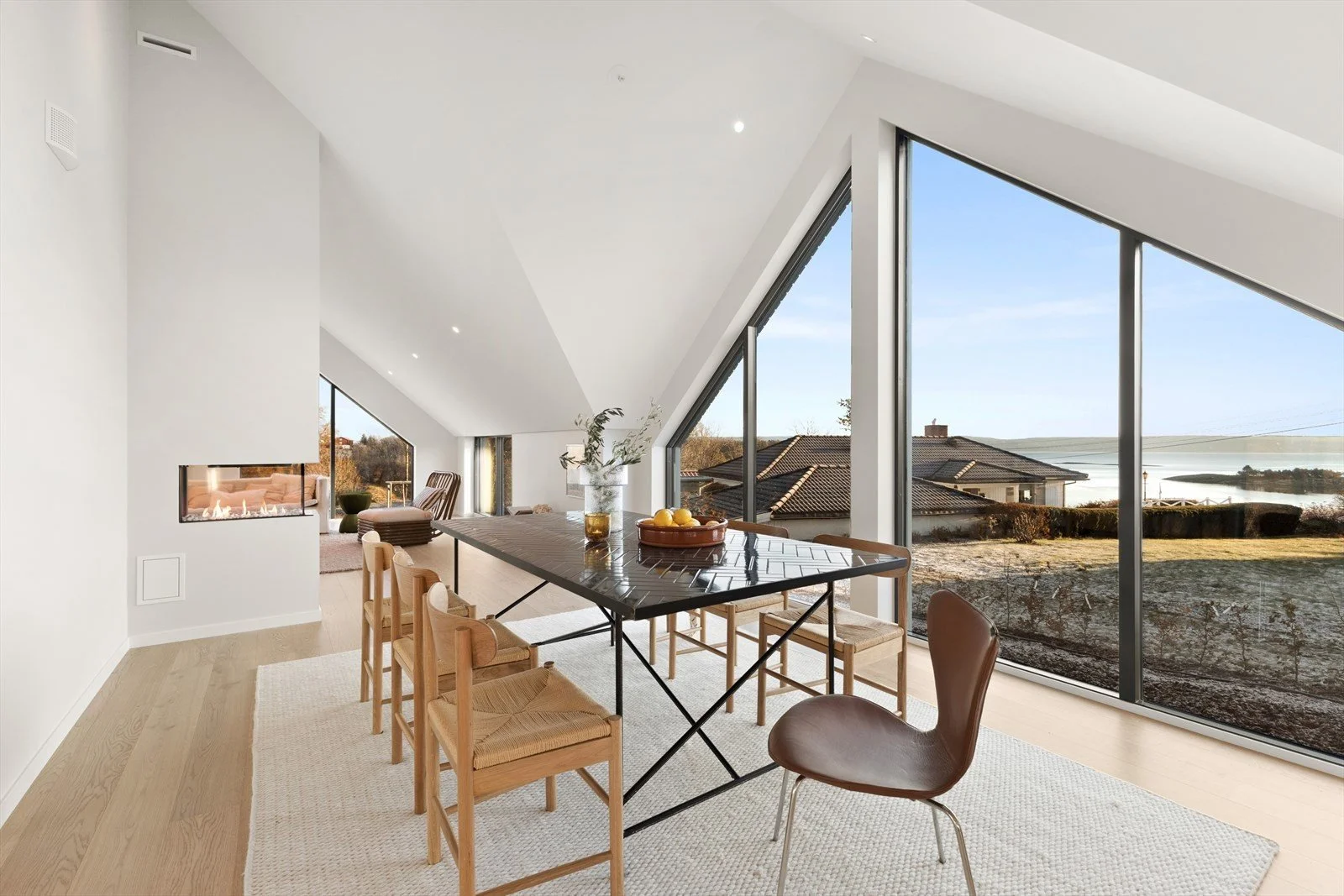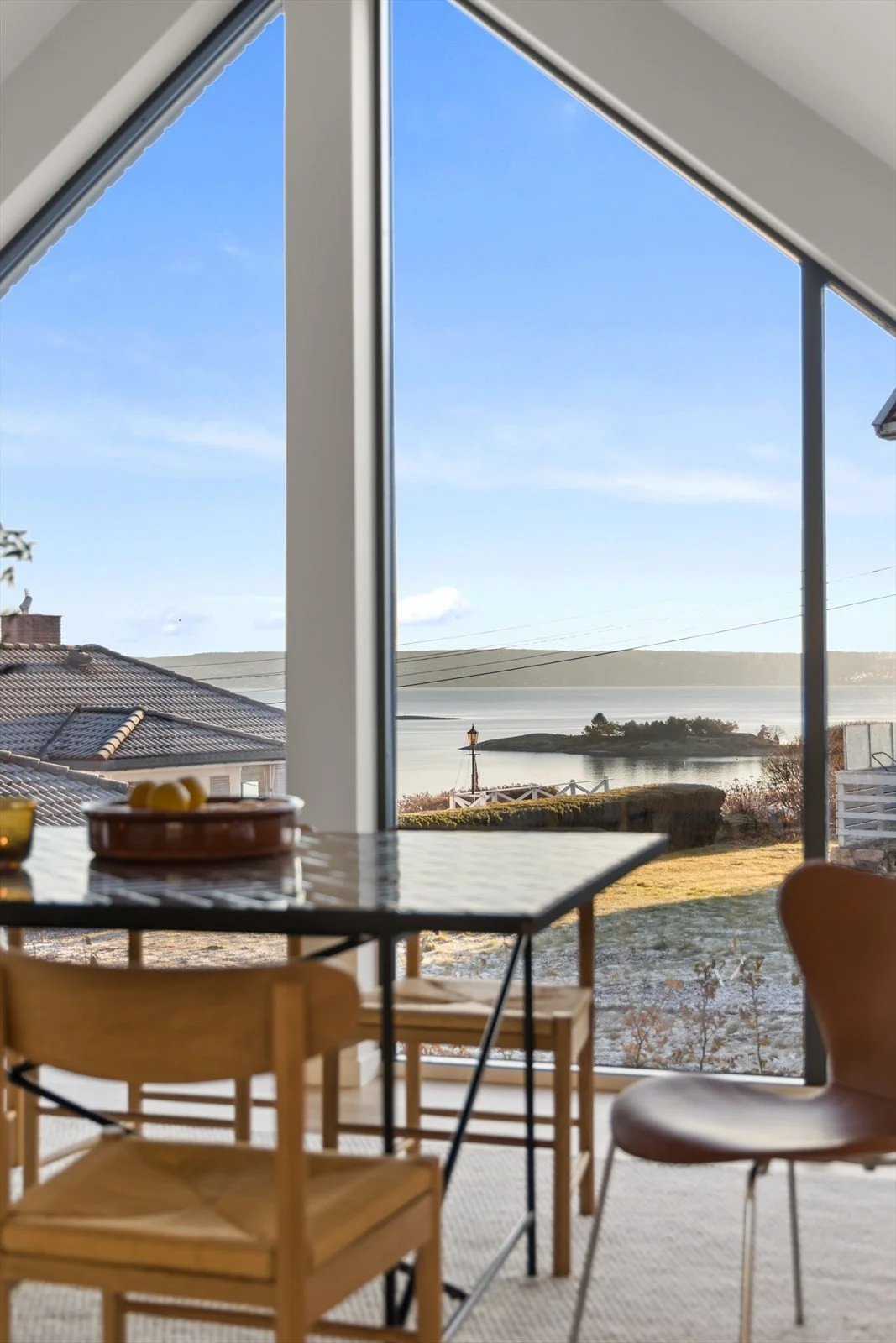 Utsikt, himmelretning og solforhold har også vært avgjørende i utformingen av boligen. Vinduene er plassert for å ivareta kvalitetene til den fantastiske utsikten fra eiendommen, og alle oppholdsrom ligger med flott utsikt til enten sjøen i sør, eller hestehagene i nord.
