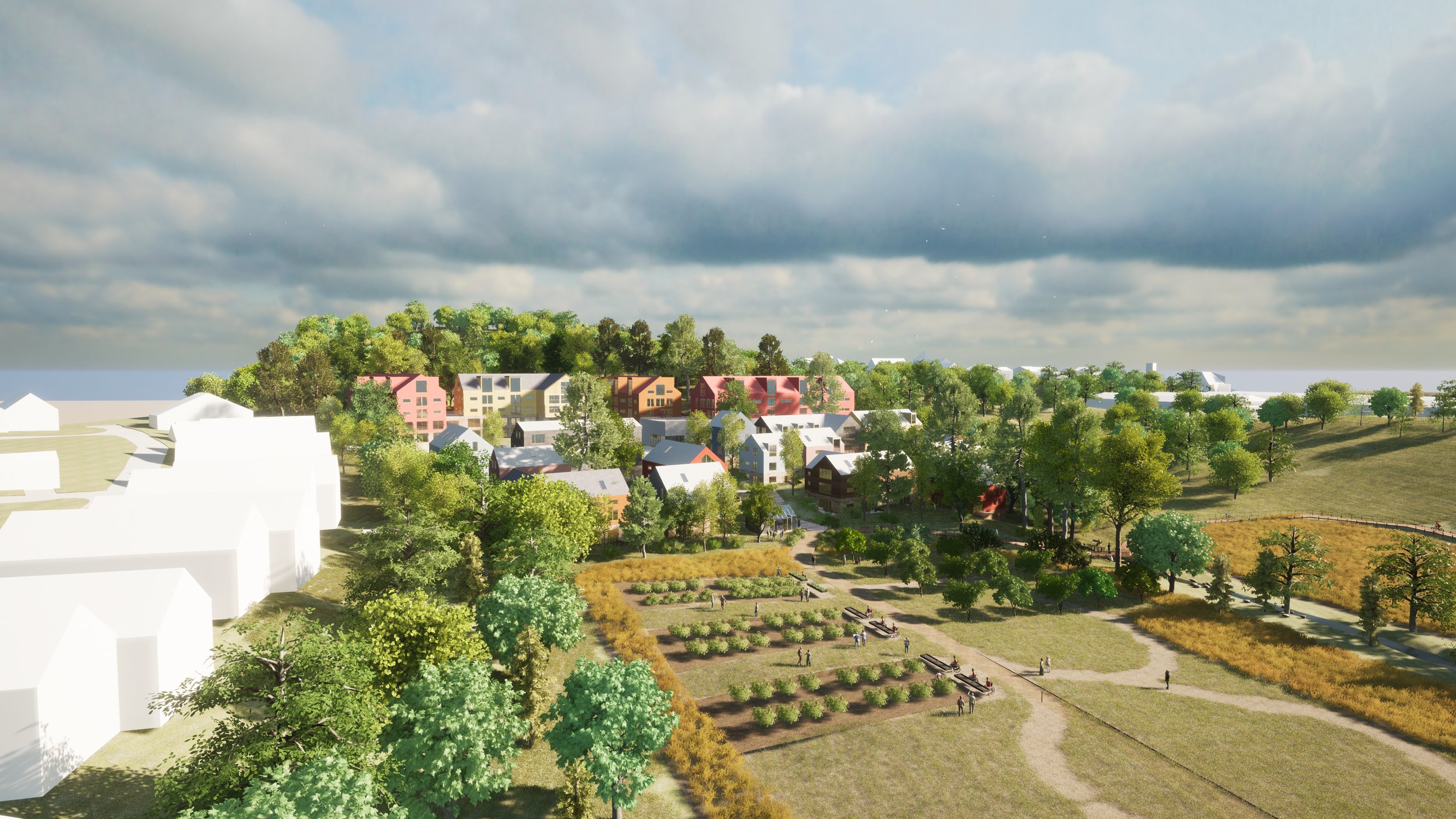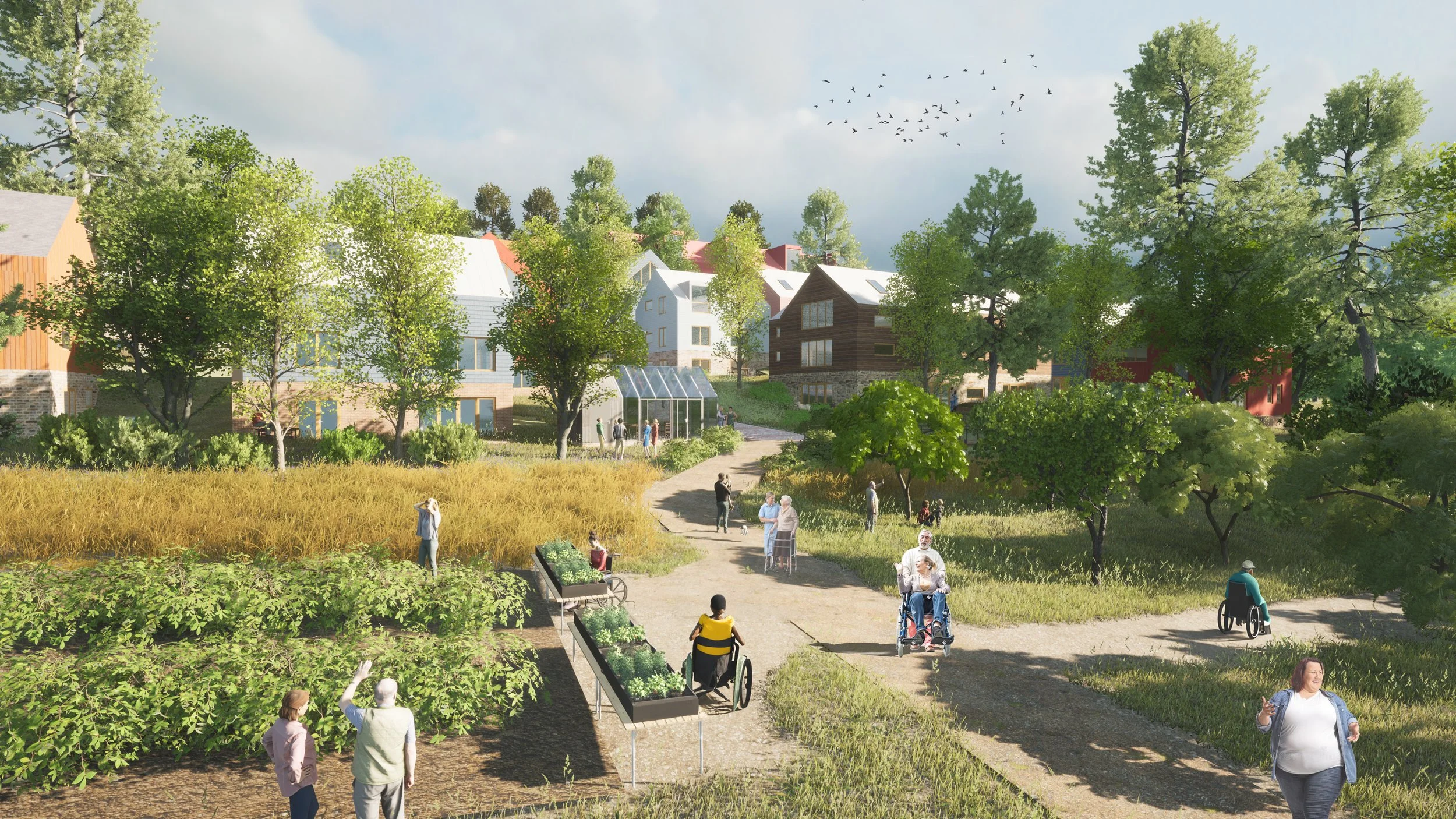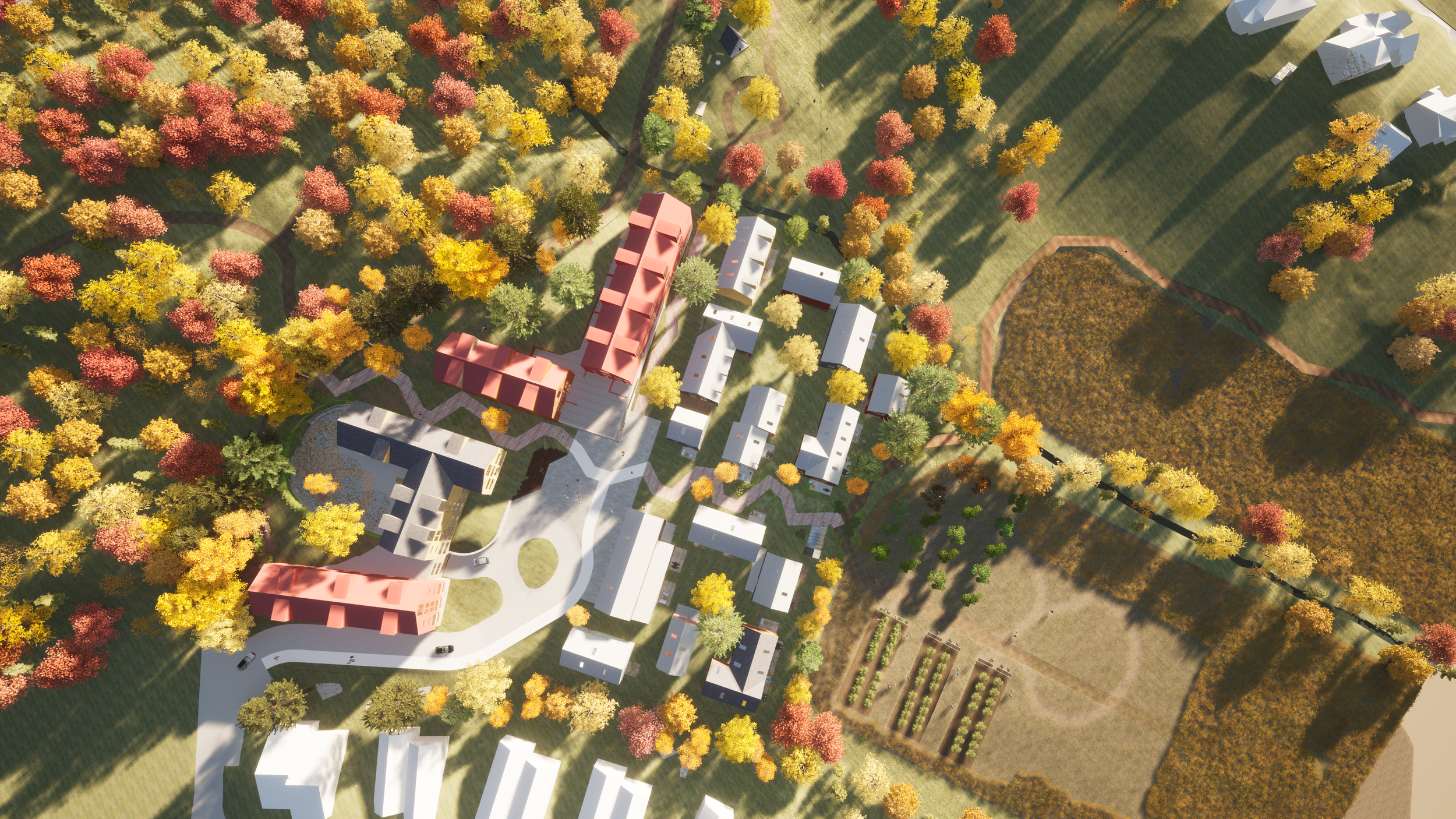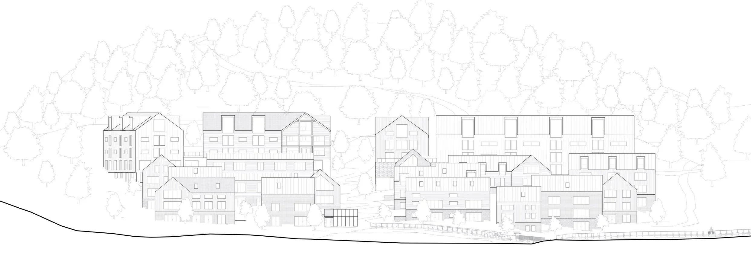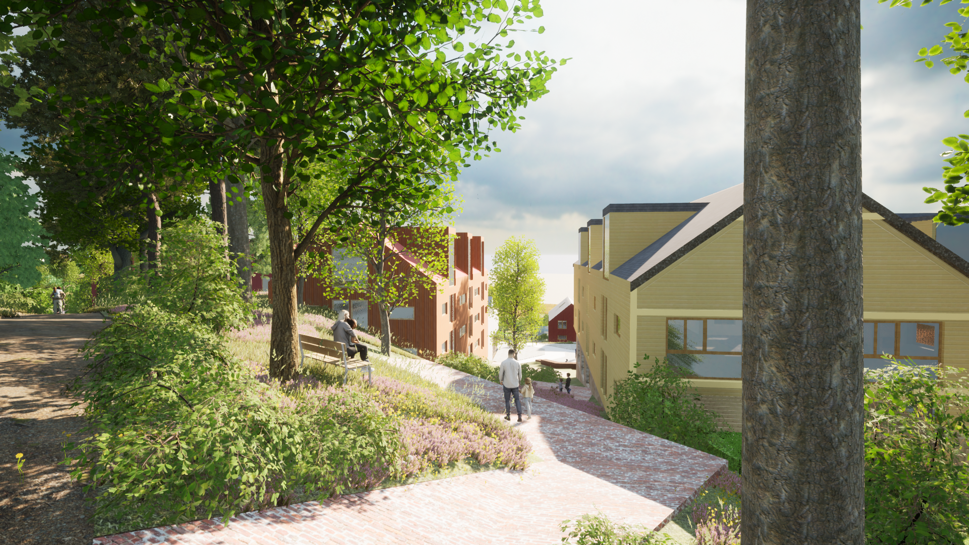 Bebyggelsen er inspirert av eldre gårdsbebyggelse, de fine uterommene man finner mellom dem, og deres variasjon i størrelser og plassering. Bebyggelsen er organisert rundt fire forskjellige tun, som fungerer som sosial møteplass. Bebyggelsen rundt de to tunene lengst vest har en form inspirert av låver, og er planlagt med en enhet for heldøgns omsorg i det ene tunet og et aktivitetssenter i det andre tunet. De to tunene lengst øst har småhustypologi og rommer i hovedsak leiligheter.